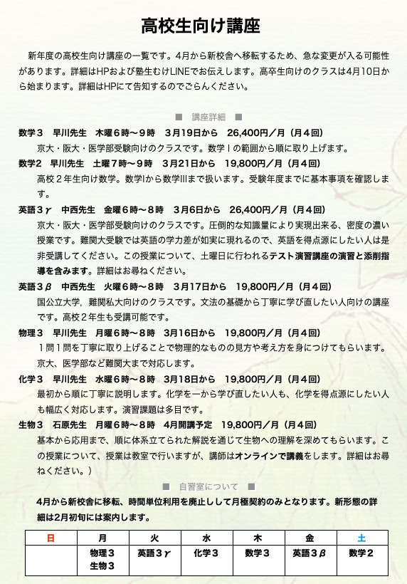 在籍生および保護者の皆さまには、移転や新年度体制について、個別に順次ご案内いたします。